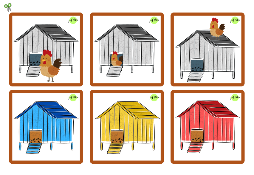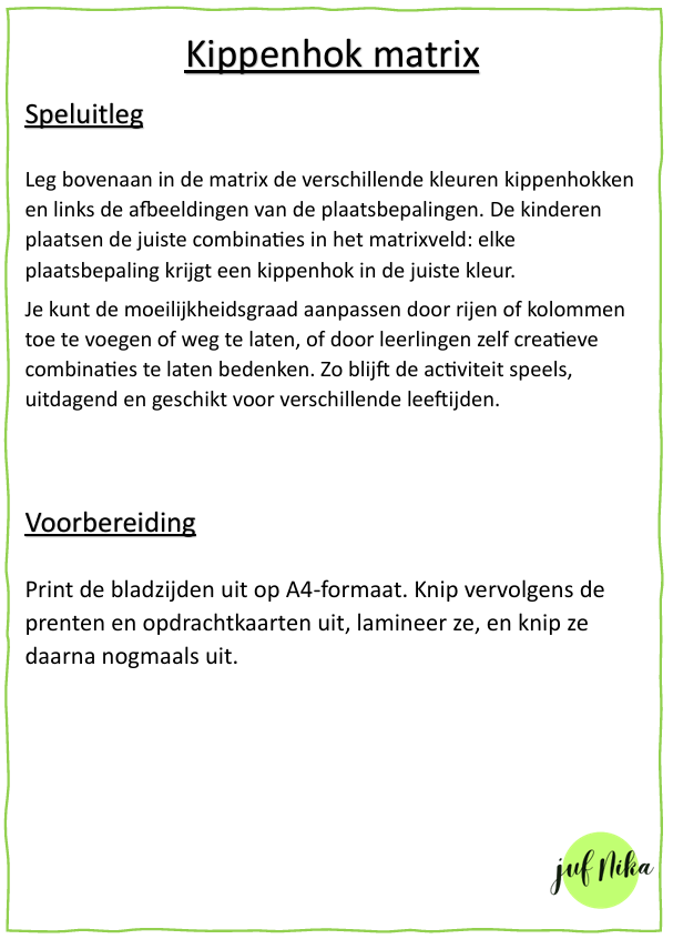 Oefen spelenderwijs de plaatsbepalingen “in, op en voor” met deze kippenhok matrix! Daarnaast oefenen de kleuters ook hun kleurenkennis in: de basis- en mengkleuren.